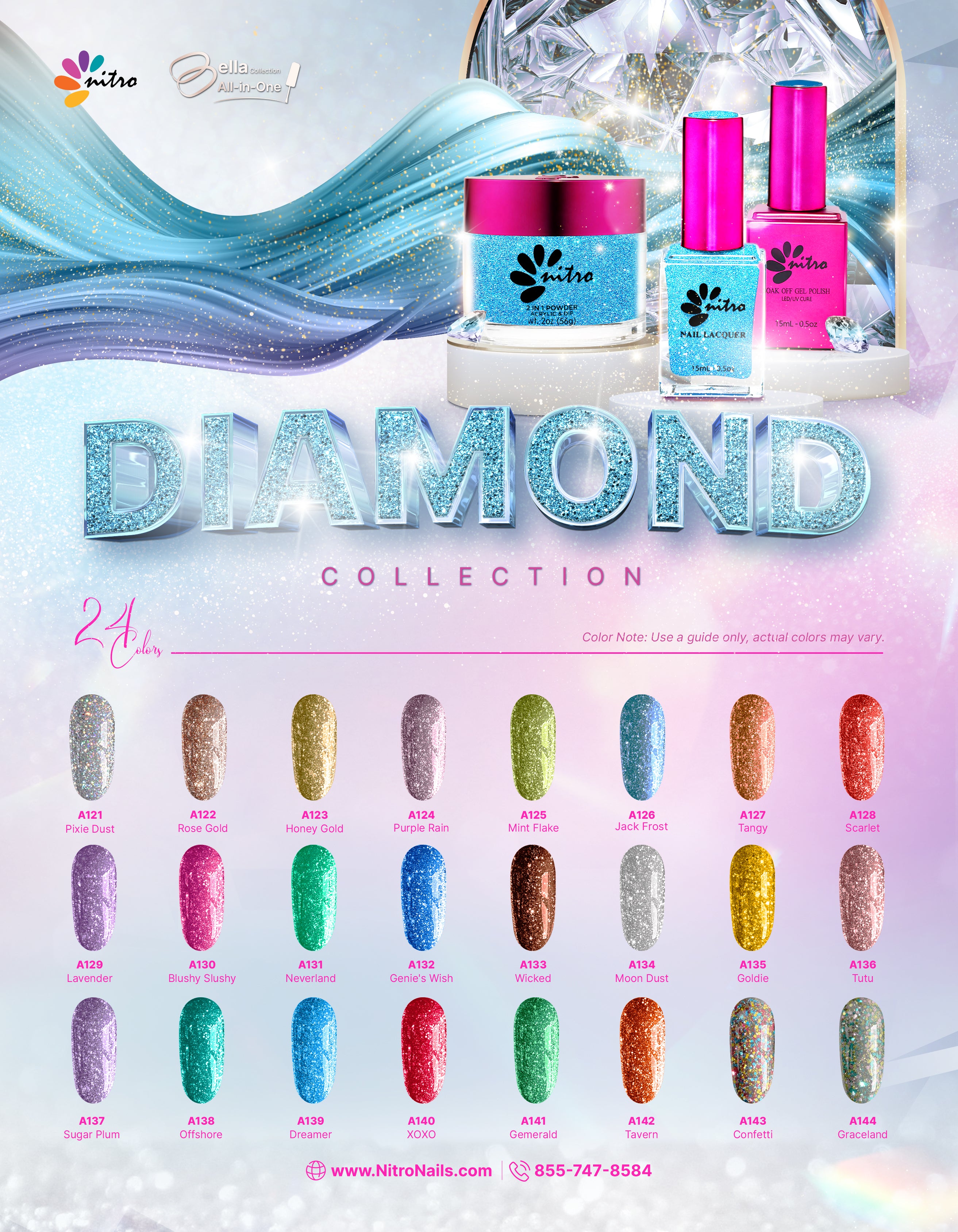 Elevate your holiday nail game with Nitro's latest winter collection, Diamond with 24 supreme glitter colors enhancing the upcoming excited Festive Seasons. Unveiling the Acrylic-Dipping Powder System, a superior nail enhancement solution designed to make your nails dazzle this season.
