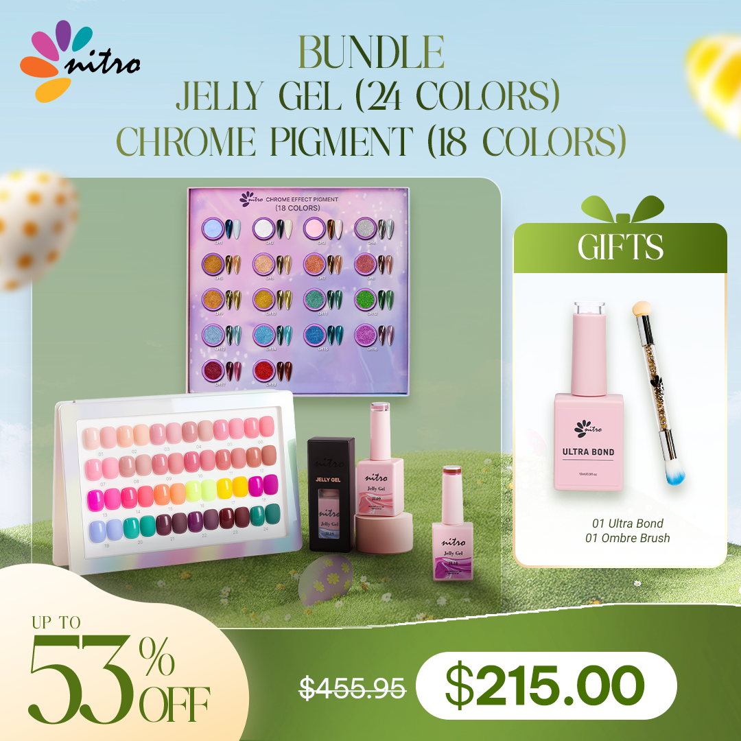 Elevate your nail artistry and maximize your savings with this top-tier Nitro bundle. Combining the soft, glass-like base of our Jelly Gels with the high-impact mirror effect of our Chrome Pigments, this collection gives you unlimited creative freedom—perfect for everything from trendy "glazed donut" aesthetics to bold, futuristic metallic designs.